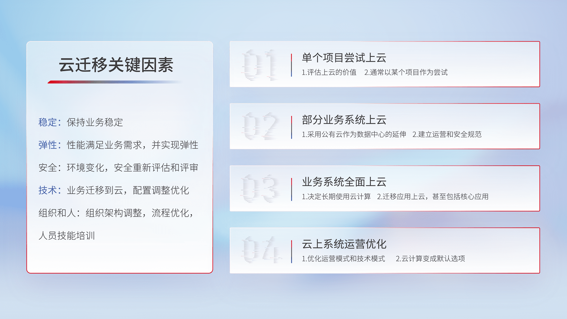 结合实际业务,,从规划设计、、云平台选型、、、、云原生改造、、数据迁移、、、、集成交付,,,迁移全过程为客户识别最佳上云路径,,,,做好风险识别管理,,,,设计网络架构、、、身份权限、、、、安全审计合规、、操作审计、、日志审计、、监控告警策略、、、、多站点容灾设计等,,对云上基础设施进行整体规划,,,提升IT治理水平,,以满足弹性、、、、高可用、、高性能的需求。。。