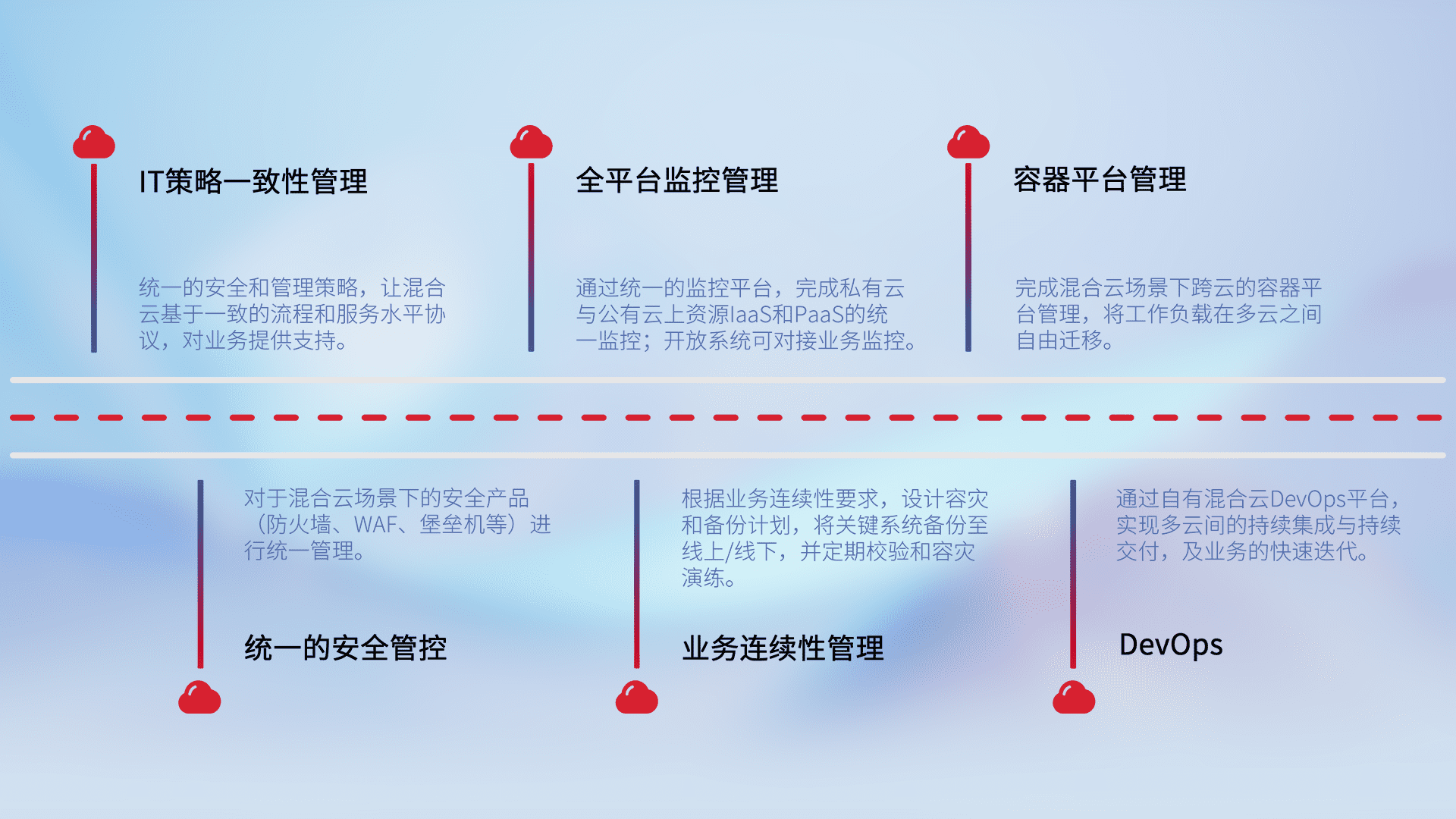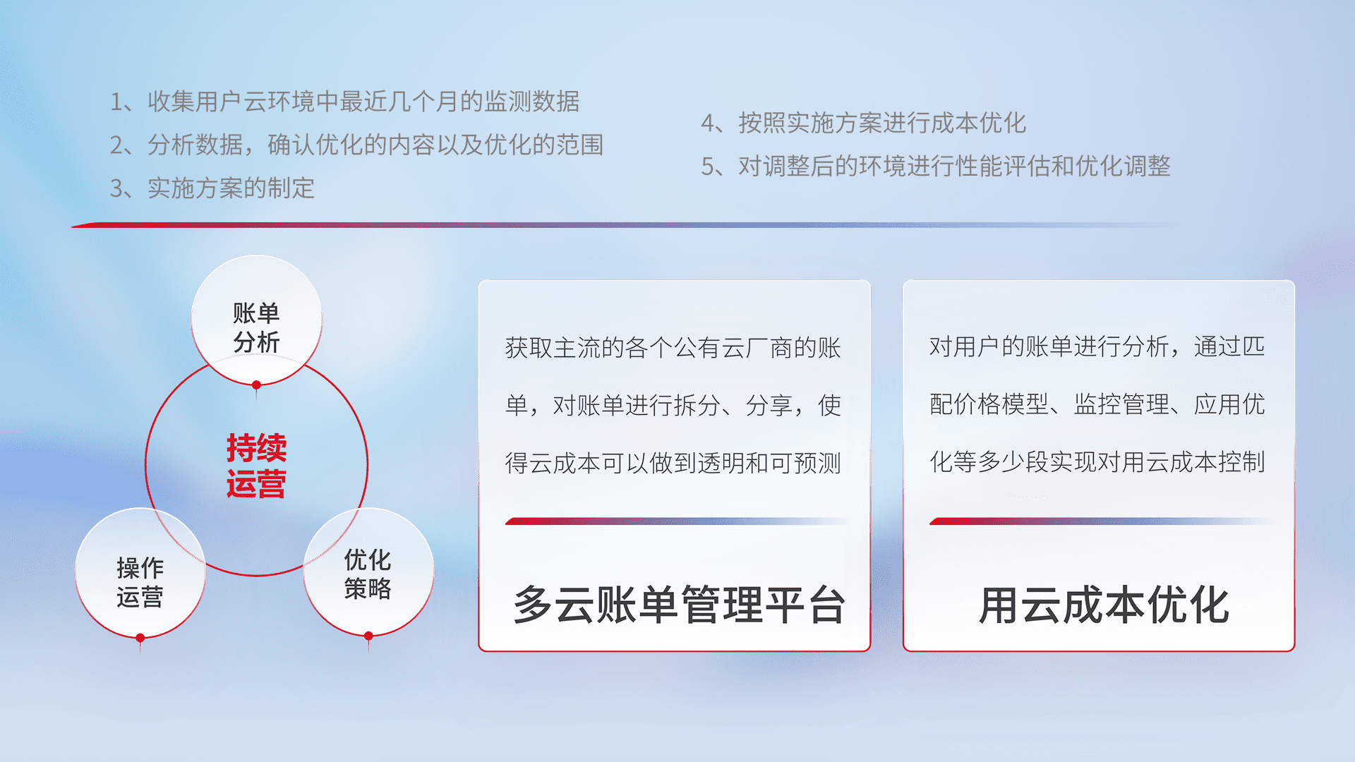 通过多云纳管,,以统一的资源数据模型把客户的云资源进行抽象和封装,,,进而实现对多云资源的统一操作,,,,保障云资源管理的可靠性、、稳定性与可用性。。量身定制化运维内容,,,,配置、、开发运维、、、、补丁管理、、、备份、、、监控、、、、认证和访问管理、、、审计和日常巡检等,,保障在用云过程中的可靠度,,,,稳定度以及高可用率。。